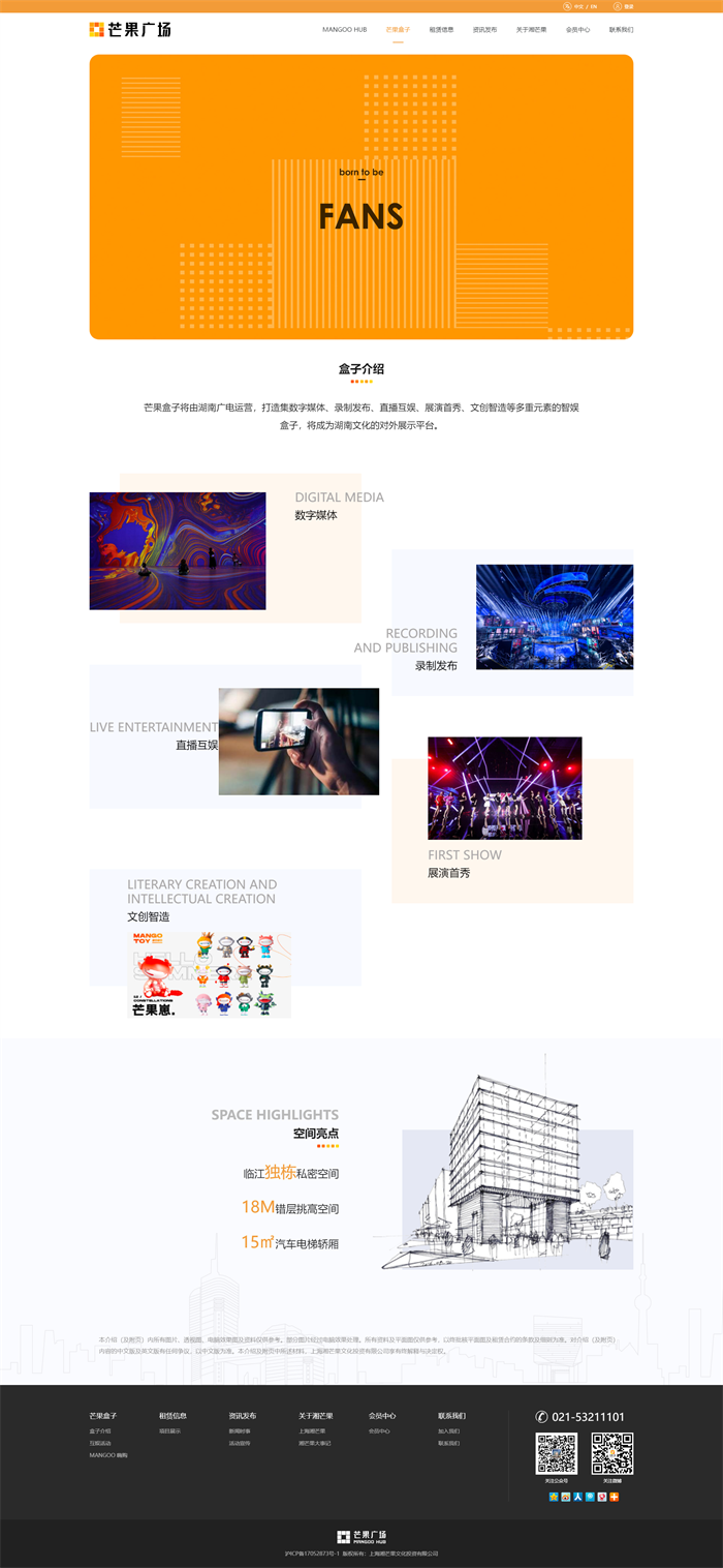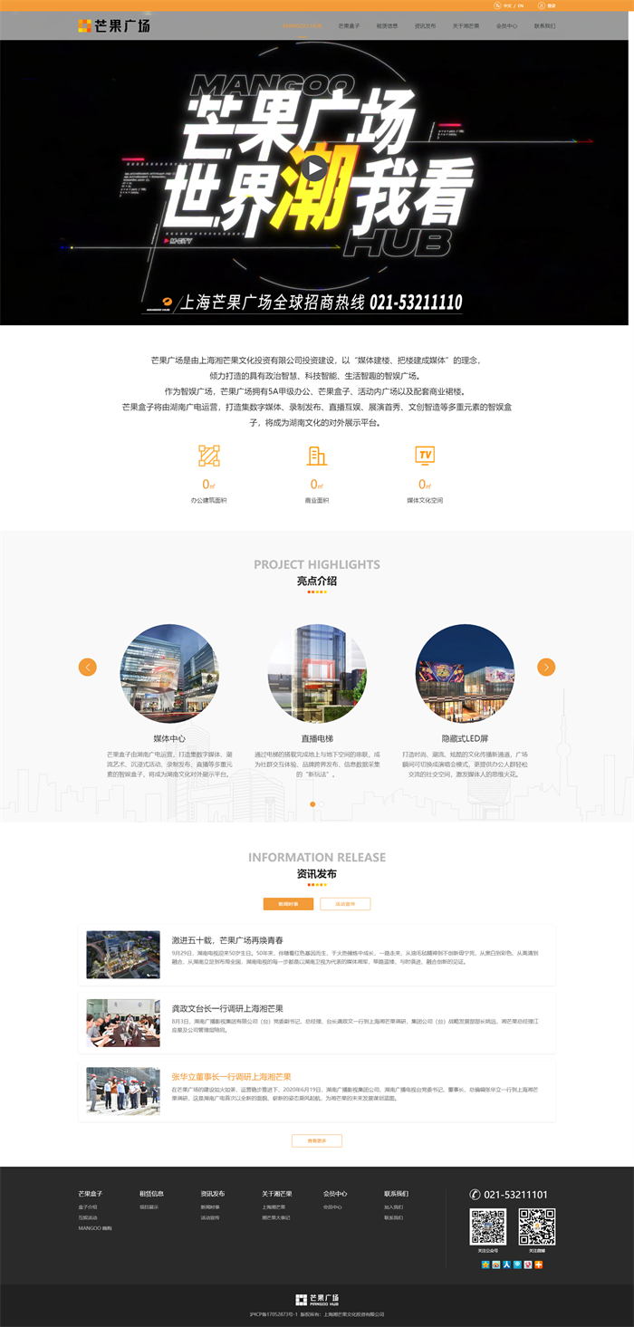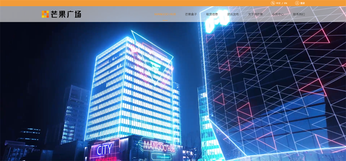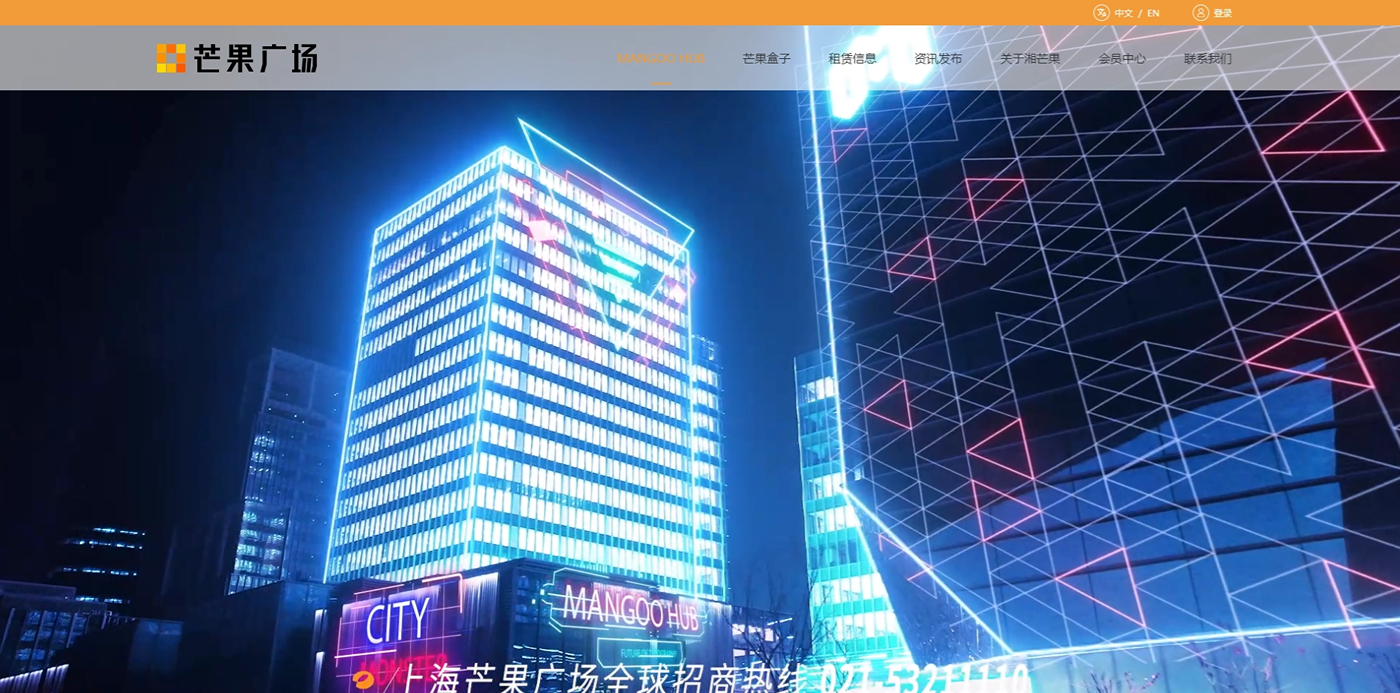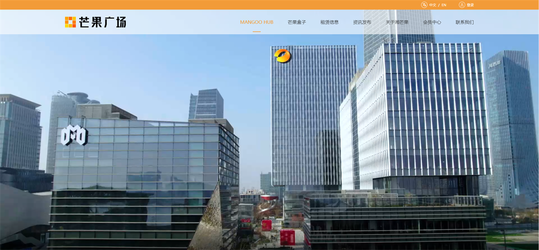 以芒果广场的品牌VI为基础,整体采用白色为主,点缀橙色,主要业务面向国内及国外,所以网站需要中英文双语版本。